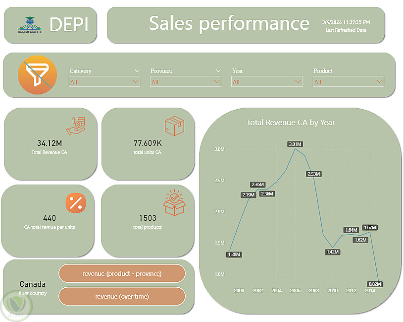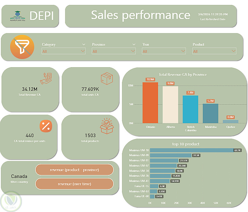 هذا المشروع عبارة عن داشبورد لتحليل أداء المبيعات تم تطويره باستخدام Power BI، ويهدف إلى تحليل الإيرادات وعدد الوحدات المباعة وأداء المنتجات عبر المقاطعات المختلفة في كندا.