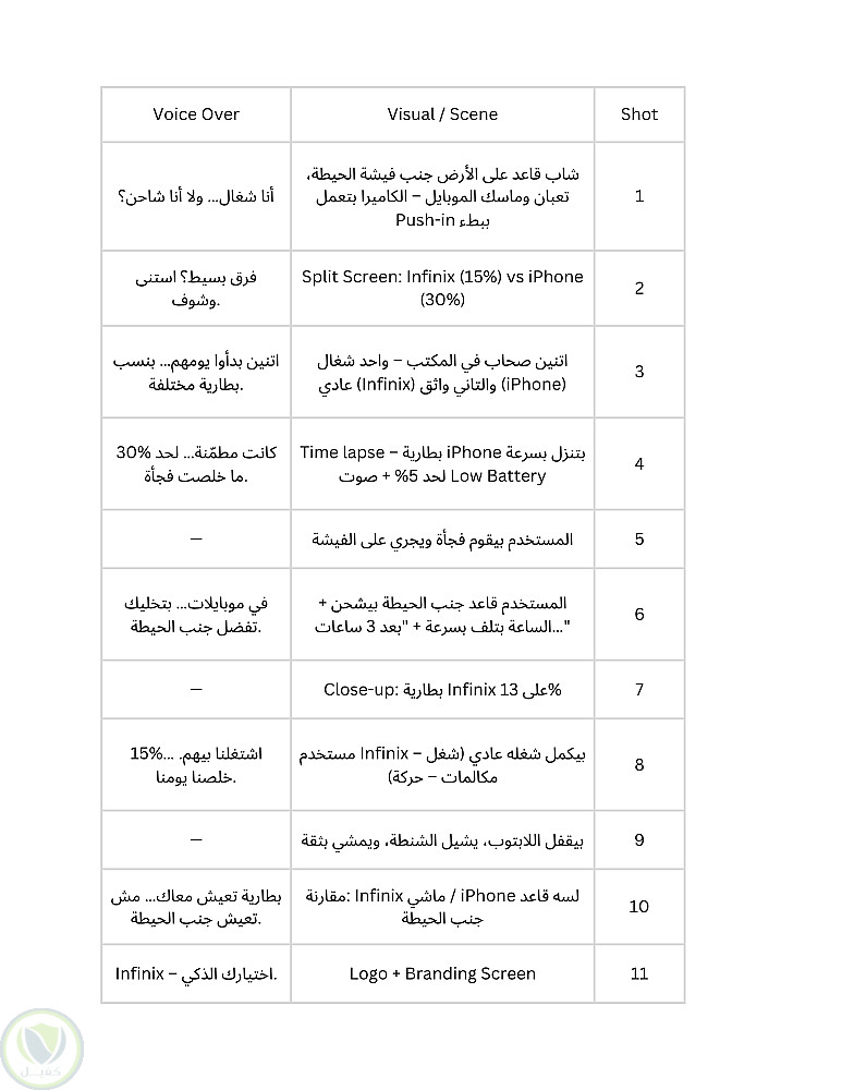 فيديو سكريبت لاعلان لتليفون انفينكس وفكرته ببساطة هو المقارنة بين البطارية بين انفينكس وايفون بدون ذكر اسم ايفون في الاعلان وهنا تم التركيز عل نقط القوي في هواتف انفينكس ومنها البطارية وتم كتابة الاسكريبت بطابع السخرية الغير واقعية