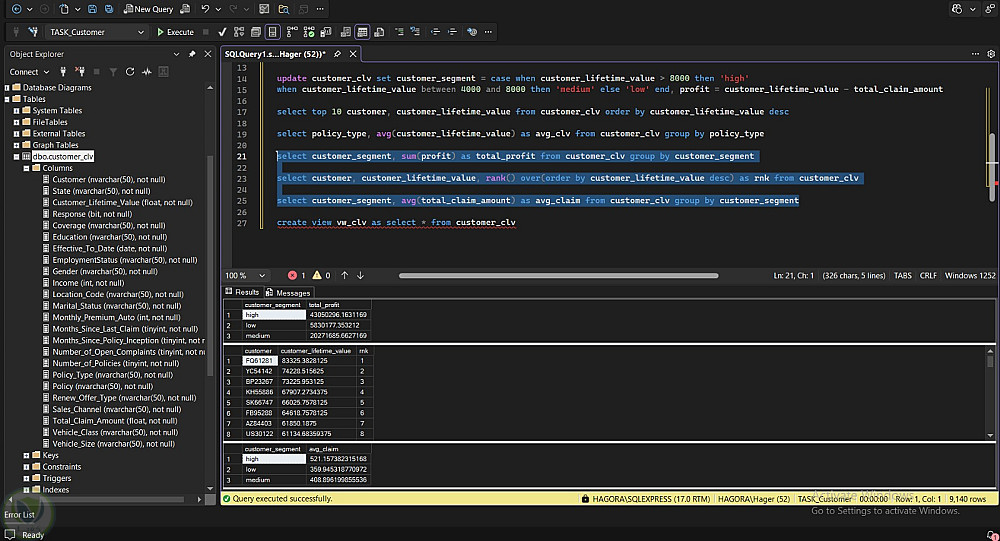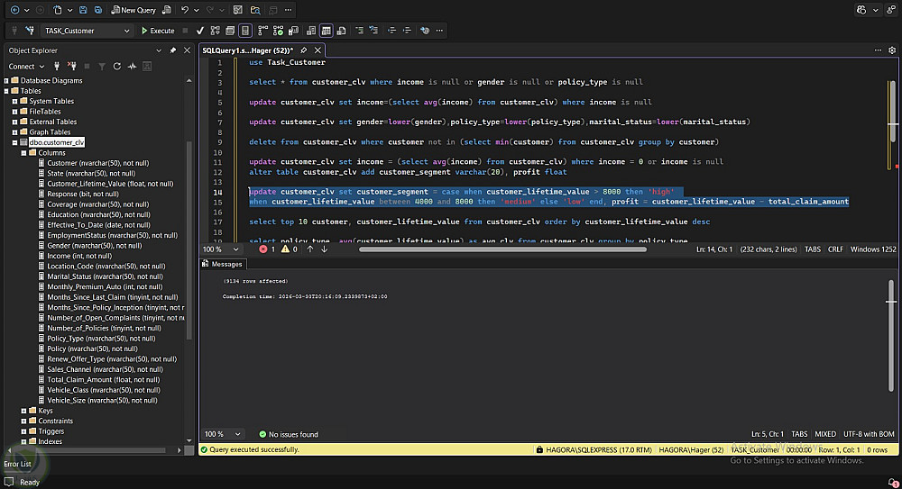 2.هندسة البيانات: تصنيف العملاء إلى (High, Medium, Low) بناءً على الـ Lifetime Value باستخدام Case Statements.