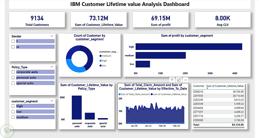قمت في هذا المشروع بتحليل بيانات قطاع التأمين (IBM Dataset) لاستخراج رؤى حول ربحية العملاء وقيمتهم الحيوية.