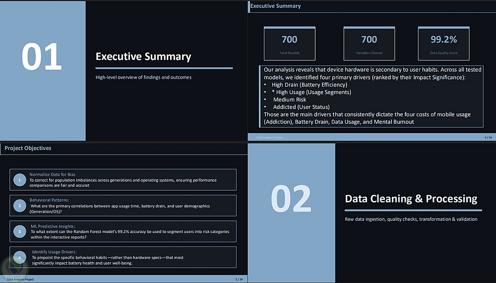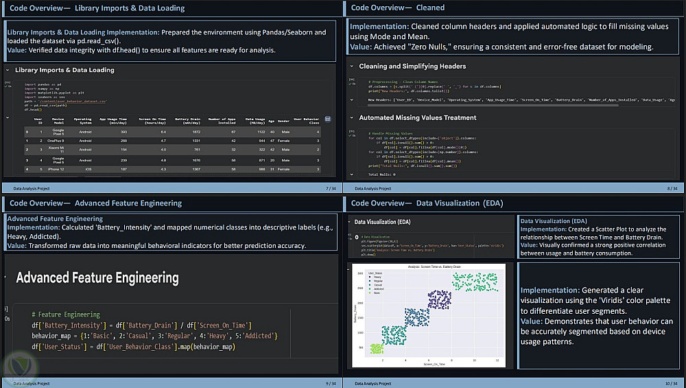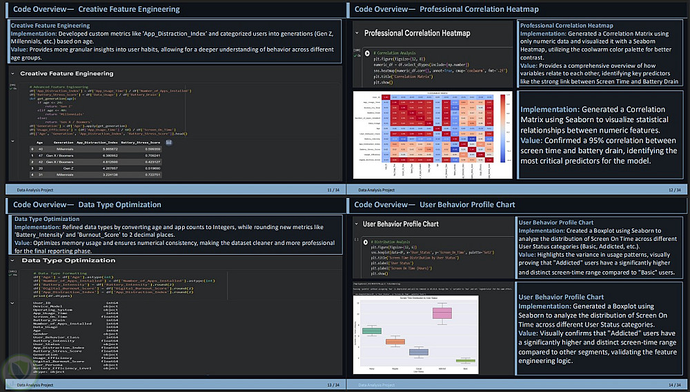 4.هندسة الميزات (Feature Engineering): تحديد أهم العوامل المؤثرة في استهلاك البطارية (Battery Drain) وأنماط الاستخدام (Usage Patterns) لربطها بالنتائج النهائية.