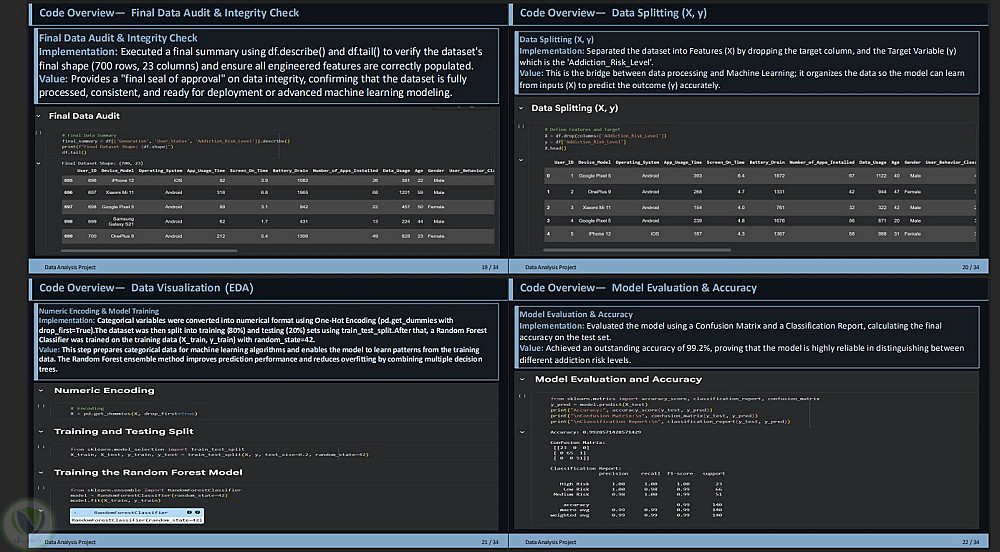 2.بناء النموذج التنبؤي: تطوير نموذج تعلم آلة باستخدام خوارزمية Random Forest Classifier لتصنيف المستخدمين حسب درجات الخطورة والاستخدام.