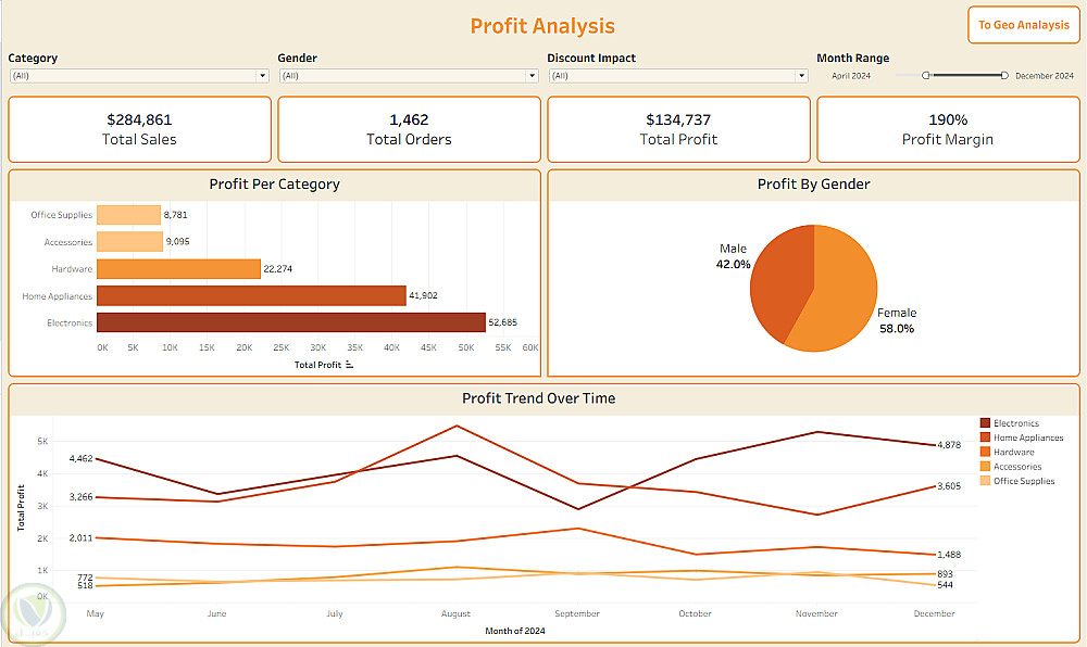 تعرض اللوحة مؤشرات رئيسية مثل إجمالي المبيعات، عدد الطلبات، إجمالي الأرباح، ونسبة هامش الربح، بالإضافة إلى تحليل تفصيلي للأرباح حسب الفئات المختلفة (مثل الإلكترونيات والأجهزة المنزلية وغيرها).