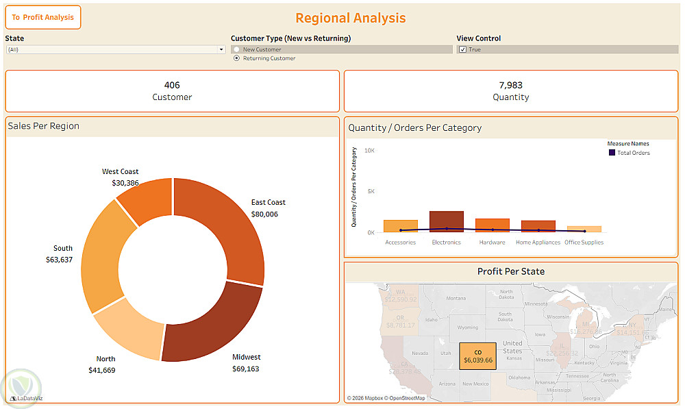 Dashboard باستخدام Tableau لتحليل الأرباح والمبيعات