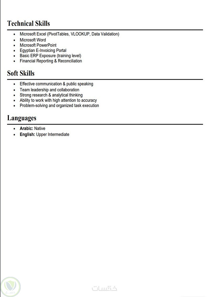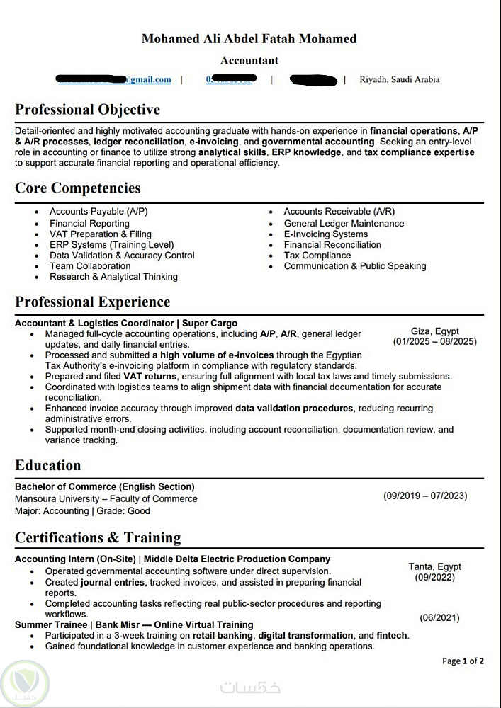 الهدف كان تحويل سيرة ذاتية تقليدية لمحاسب إلى سيرة ذاتية احترافية تتوافق مع أنظمة (ATS). التحدي كان في إبراز الخبرات المحاسبية المعقدة والمهارات التقنية (مثل Excel وERP Systems) بشكل مختصر ومركز يجذب مسؤولي التوظيف .