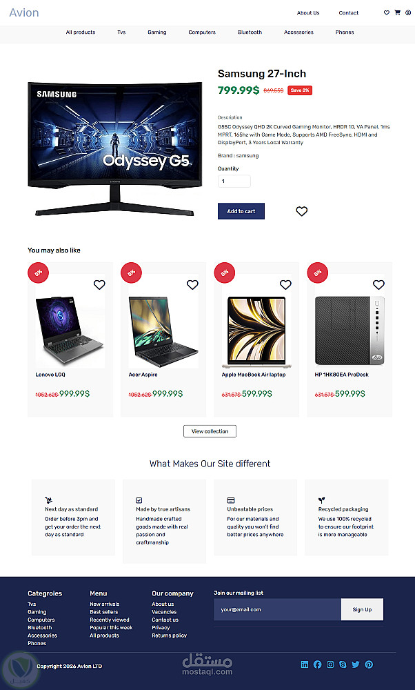 قمت بتصميم وتطوير واجهة متجر إلكتروني حديث لبيع الأجهزة الإلكترونية مثل الهواتف، الشاشات، اللابتوبات، والإكسسوارات.