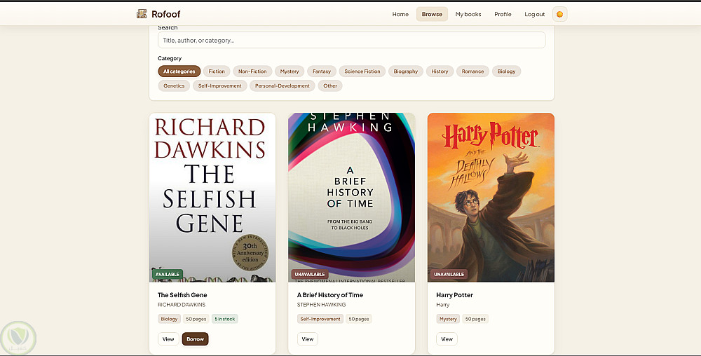 موقع كامل لإدارة مكتبة رقمية يتيح للقراء استعراض الكتب واستعارتها إلكترونيًا، مع نظام أدوار يفصل بين القارئ وأمين المكتبة.