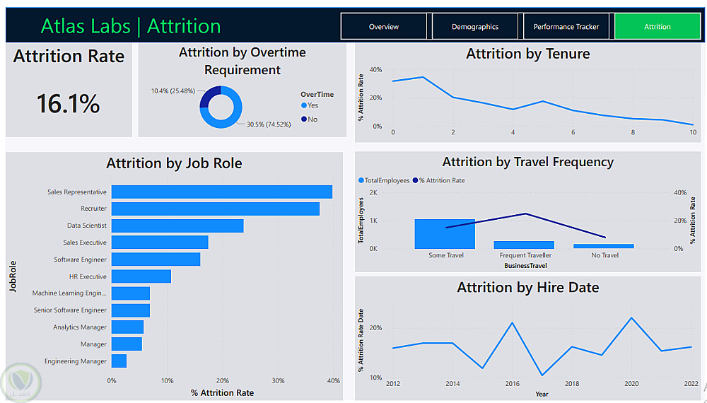 Attrition Analysis: تحليل أسباب ترك العمل بناءً على الوظيفة، مدة العمل، والسفر.