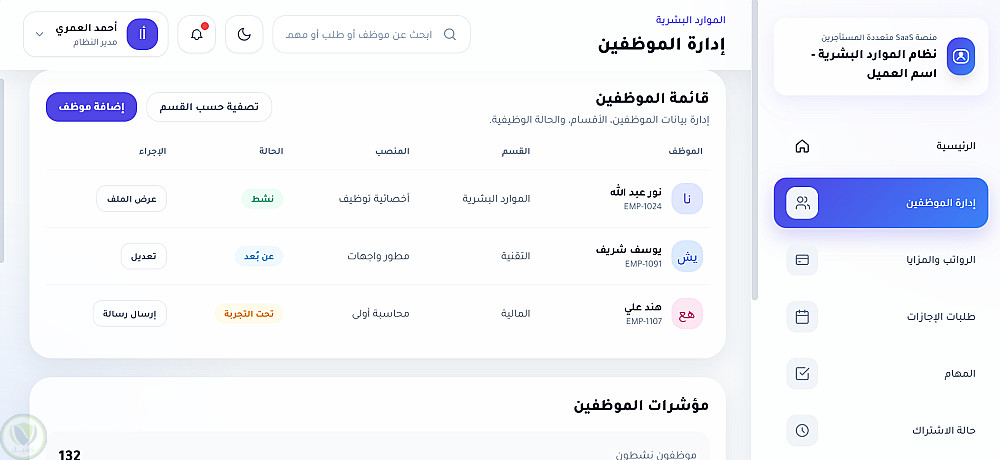 تصميم وتطوير لوحة تحكم لنظام موارد بشرية (HR SaaS Dashboard)