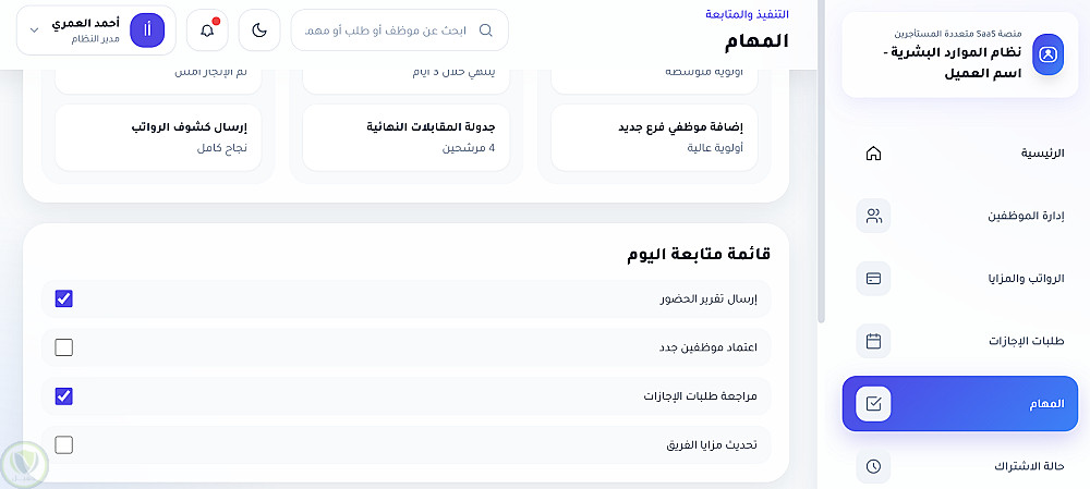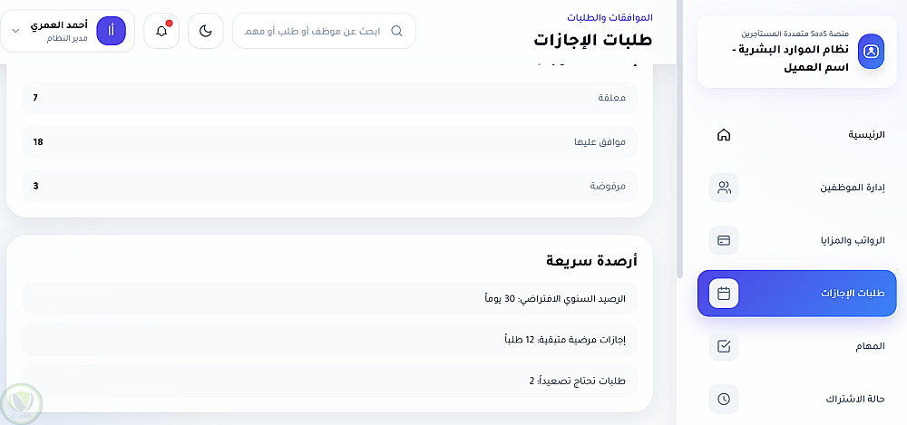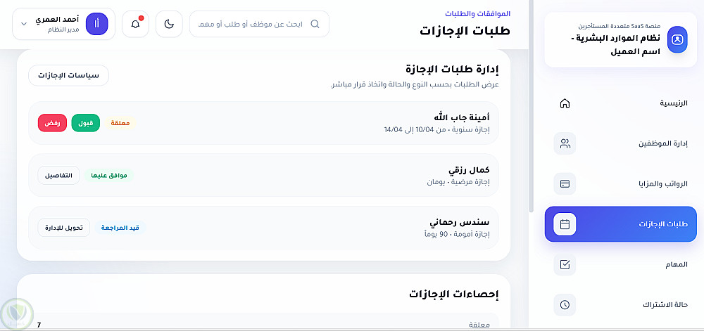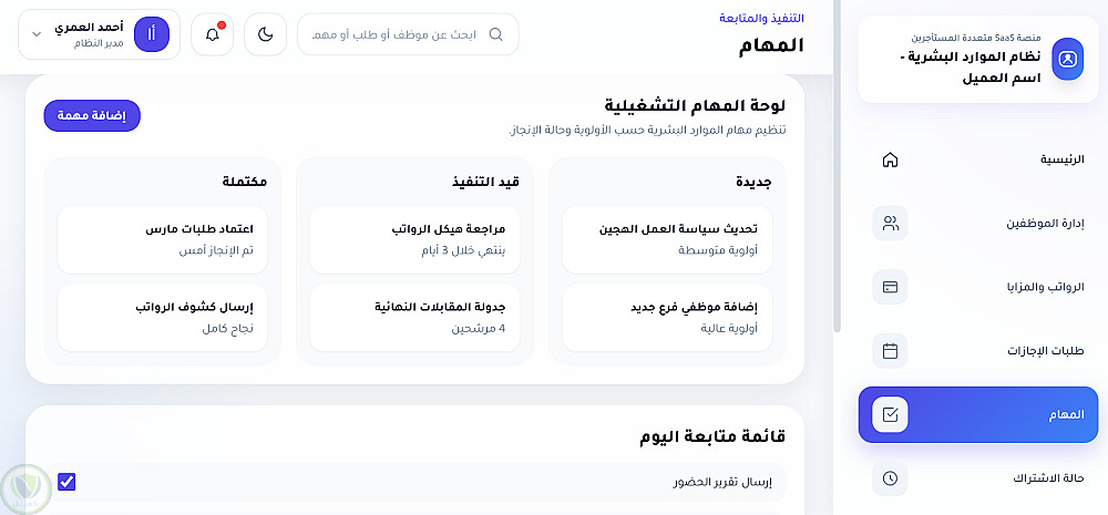 • الإجازات والمهام: نظام مبسط لمتابعة طلبات الإجازات (قبول/رفض) ولوحة لتنظيم سير عمل المهام اليومية.