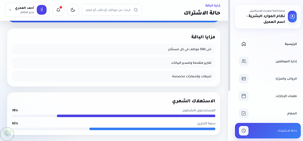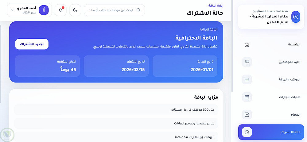 تصميم وتطوير نظام إداري حديث ومتكامل لإدارة الموارد البشرية (HR)، مبني بنموذج البرمجيات كخدمة (SaaS) ليكون متعدد المستأجرين (Multi-tenant). النظام موجه للشركات والمؤسسات لإدارة فروعها أو عملائها داخل منصة واحدة، مع دعم كامل للغة العربية وتوجيه من اليمين إلى اليسار (RTL).