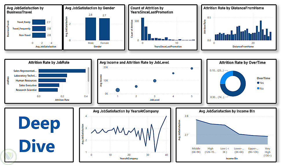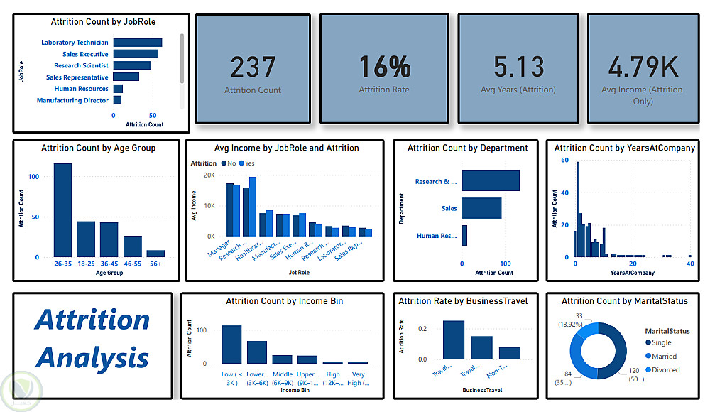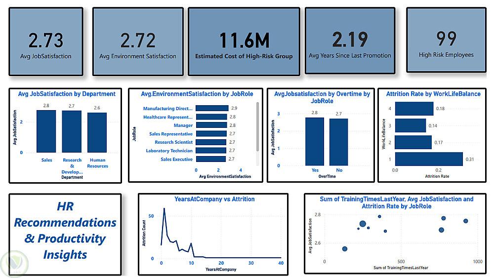 قمت بتصميم وتطوير لوحة معلومات تفاعلية باستخدام Power BI لتحليل أنماط ترك الموظفين للعمل، اعتمادًا على مجموعة بيانات حقيقية للموارد البشرية من موقع Kaggle.