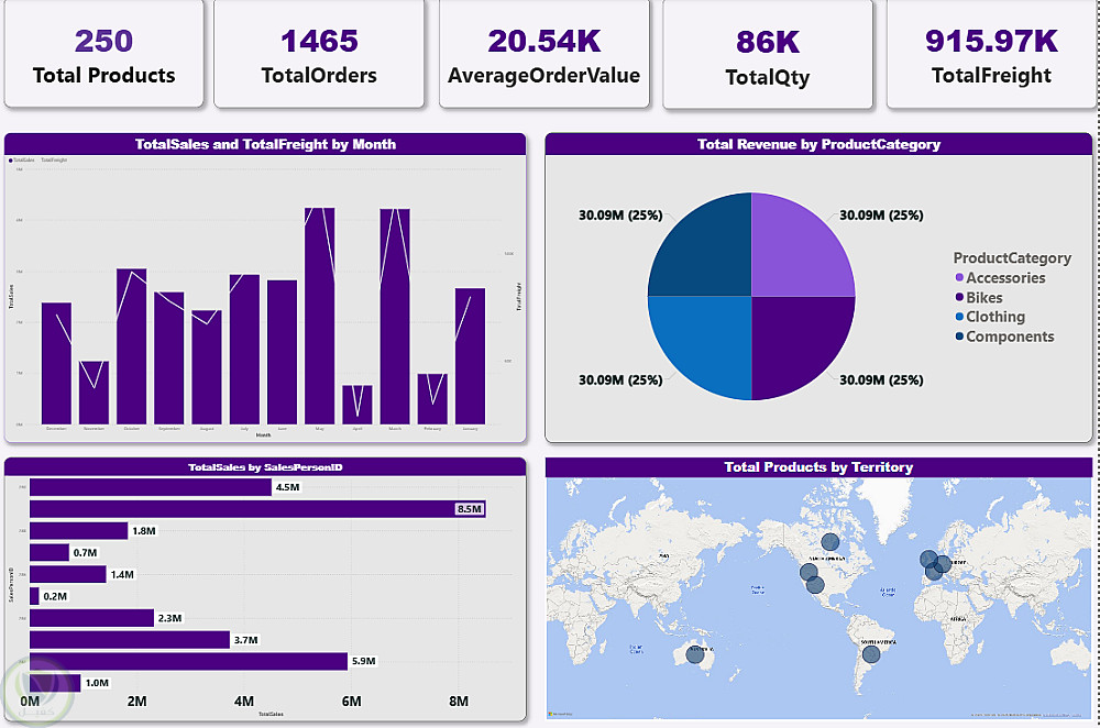 يتضمن المشروع تحليلات تفصيلية للمبيعات حسب المناطق المختلفة، وأداء مندوبي المبيعات، وتوزيع المنتجات، إلى جانب تحليل زمني شهري للمبيعات وتكاليف الشحن، مع عرض جغرافي يوضح انتشار العملاء والمنتجات.