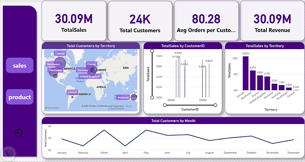 تم تصميم وتطوير لوحة تحكم (Dashboard) لتحليل أداء المبيعات العالمية عبر مناطق متعددة، مع التركيز على توزيع المبيعات حسب المناطق، أداء مندوبي المبيعات، تحليل المنتجات، ومتابعة تكاليف الشحن شهرياً. تهدف اللوحة إلى عرض مؤشرات الأداء الرئيسية مثل إجمالي المبيعات، عدد العملاء، عدد الطلبات، ومتوسط قيمة الطلب لدعم اتخاذ قرارات دقيقة.