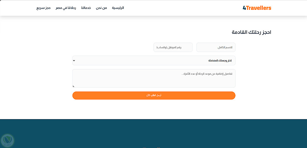 قمت بتصميم وتطوير صفحة هبوط (Landing Page) حديثة لشركة سياحة مصرية باسم "4Travellers"، بهدف عرض الخدمات السياحية بطريقة جذابة وتحفيز الزوار على الحجز والتواصل.