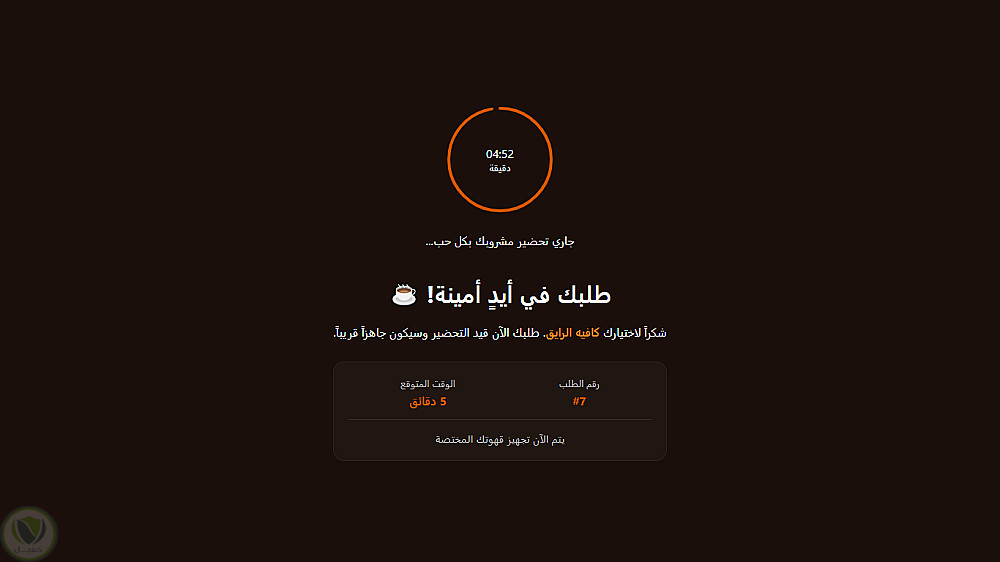 تتبع الطلب لحظياً (Real-time Tracking): صفحة انتظار تفاعلية مزودة بمؤشر زمني (Timer) لإبلاغ العميل بالوقت المتبقي لتجهيز مشروبه.
