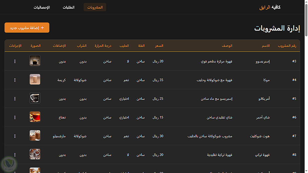 لوحة تحكم شاملة (Admin Dashboard): نظام خلفي متطور يتيح لصاحب العمل إدارة قائمة المشروبات، تعديل الأسعار، ومتابعة إحصائيات الطلبات بسهولة تام