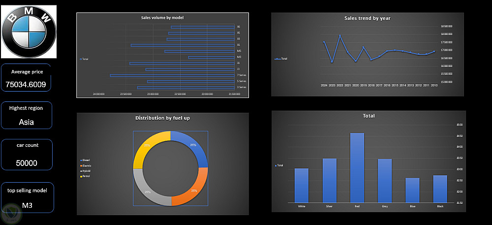 قمت بتصميم داشبورد تحليلي شامل لمبيعات شركة BMW يغطي بيانات من 2010 حتى 2024، بإجمالي 50,000 سيارة محللة بالكامل.