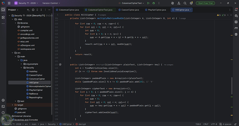 هذا المشروع هو إطار عمل شامل قائم على جافا ينفذ أهم خوارزميات التشفير الكلاسيكية و"متجهات الهجوم" المقابلة لها. يوضح تطور علم التشفير من استبدال الحروف البسيط إلى التحولات المعقدة القائمة على المصفوفات.