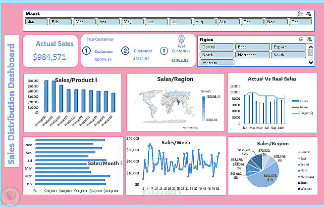 تصميم Dashboard في Excel لعرض توزيع المبيعات بشكل بصري يساعد في فهم الأداء واتخاذ القرارات.