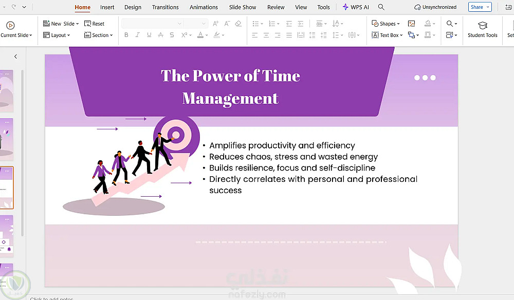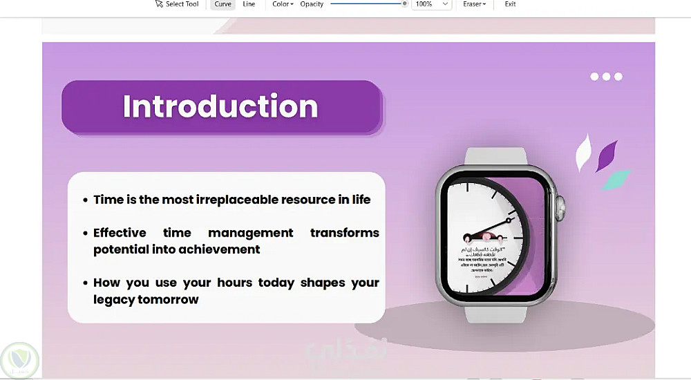 أنشأت باور بوينت يوضح أهمية الوقت و طرق تنظيم وإدارة الوقت بشكل عملي ، وتحديد خطوات لإدارة الوقت وتحديد الأولويات لتحسين الإنتاجية اليومية؛
