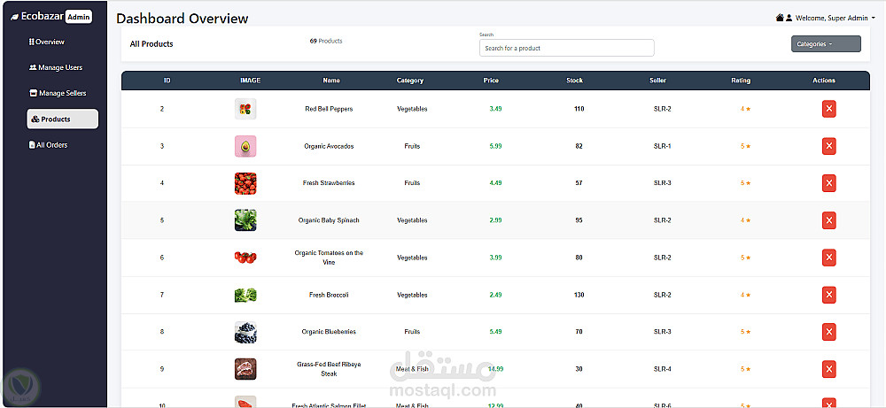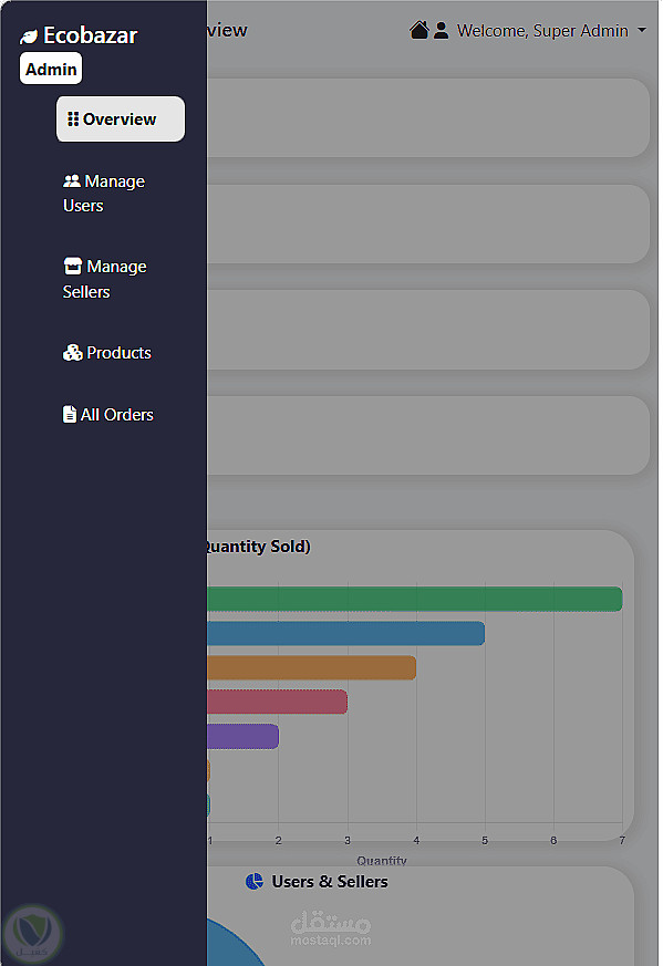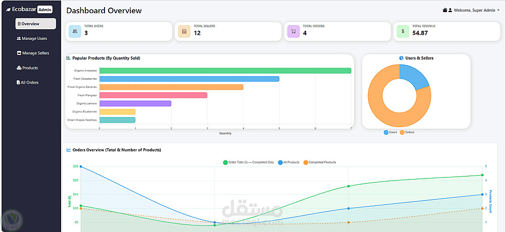 يمثل هذا المشروع لوحة التحكم المركزية (Admin Panel) الخاصة بإدارة منصة EcoBazar، وهي منصة تجارة إلكترونية متعددة التجار (Multi-vendor). تم تصميم وتطوير هذه اللوحة لتمنح مدير النظام (Super Admin) تحكماً كاملاً ومرناً في كافة الكيانات والبيانات داخل المتجر، مع واجهة مستخدم نظيفة وعملية (Clean UI) تركز على سهولة قراءة الإحصائيات وسرعة اتخاذ الإجراءات.