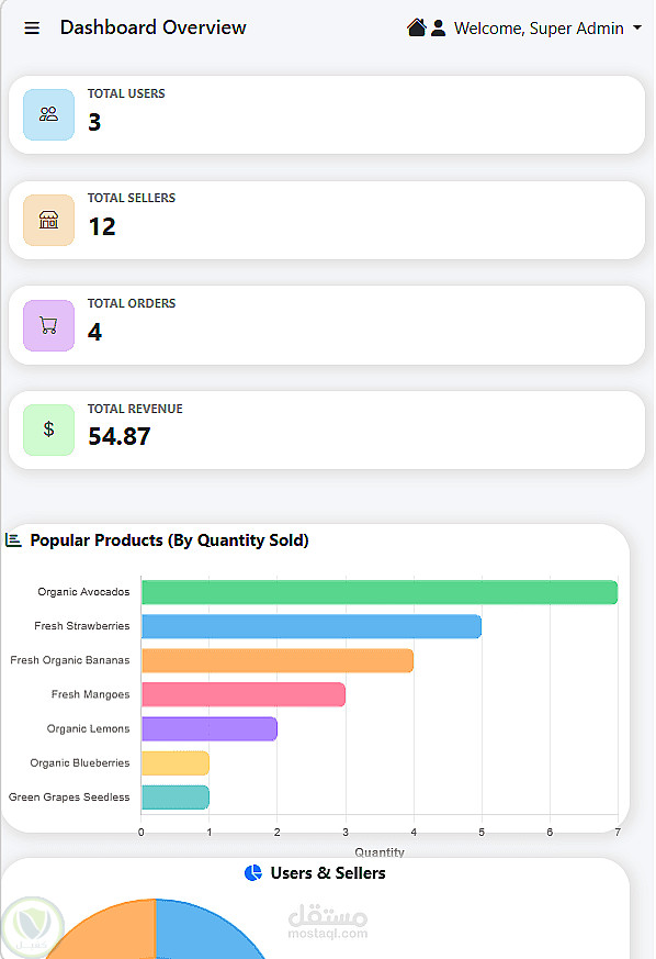 دمج رسوم بيانية تفاعلية (مخططات خطية، دائرية، وشريطية) لتحليل مسار المبيعات، نسبة المستخدمين للتجار، والمنتجات الأكثر مبيعاً بشكل مرئي دقيق.