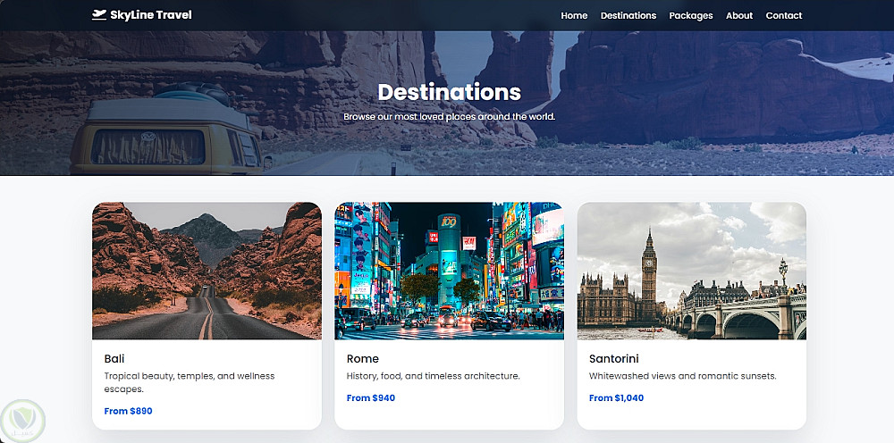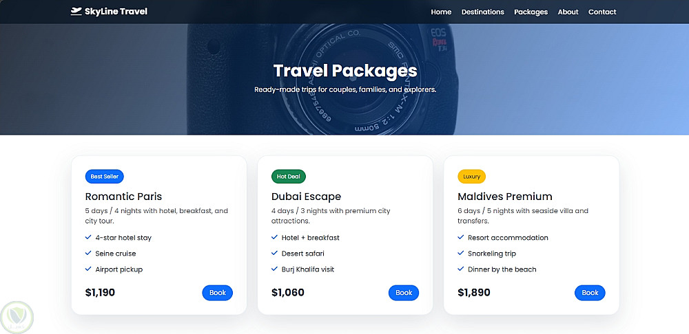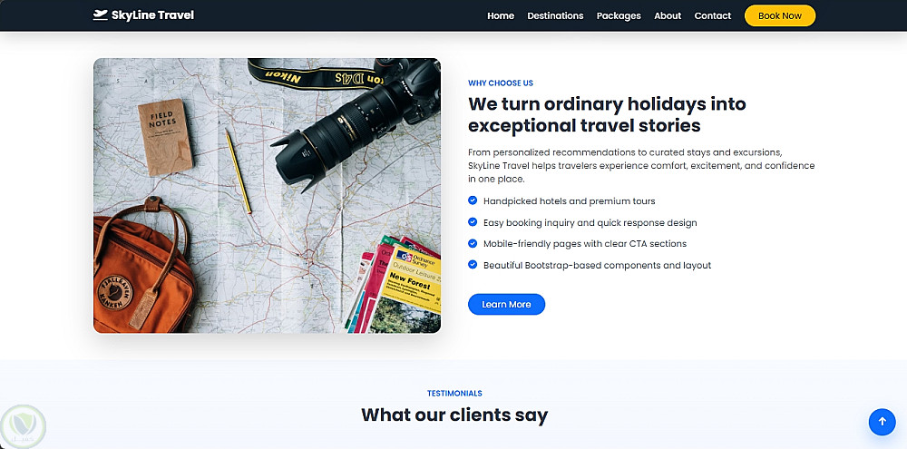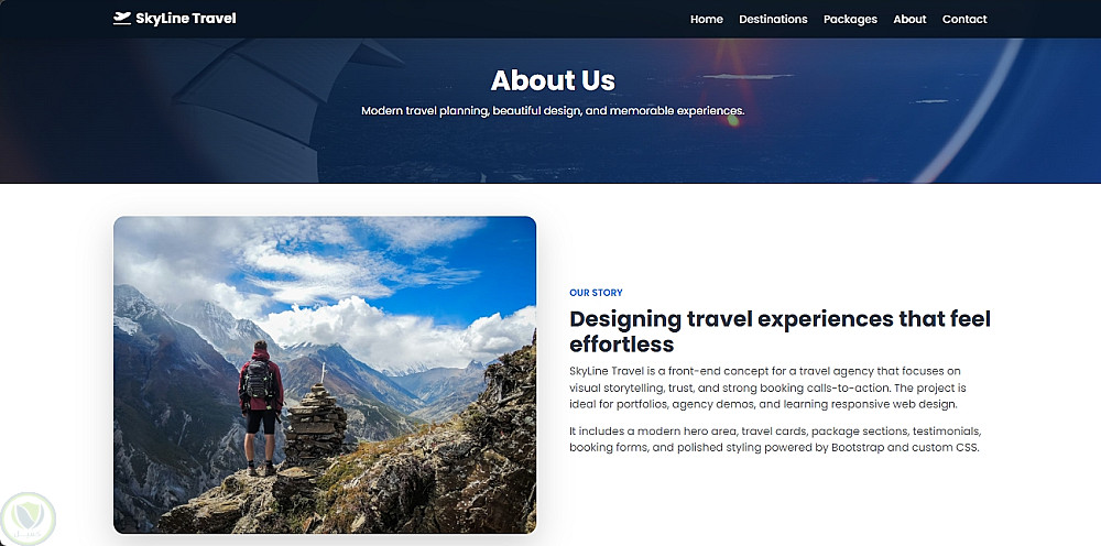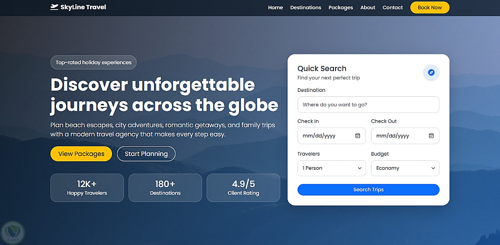 مشروع واجهة موقع وكالة سفر وسياحة تم تطويره باستخدام HTML5 وCSS3 وJavaScript وBootstrap. يطبق المشروع تقديم تصميم حديث ومتجاوب يسمح للمستخدمين باستكشاف الوجهات السياحية والعروض بسهولة. يتضمن الموقع عدة صفحات أساسية مثل الصفحة الرئيسية، الوجهات، الباقات السياحية، من نحن، والتواصل مع التركيز على تحسين تجربة المستخدم، تنظيم الواجهة، وبناء تصميم متجاوب يعمل بكفاءة على مختلف الأجهزة.