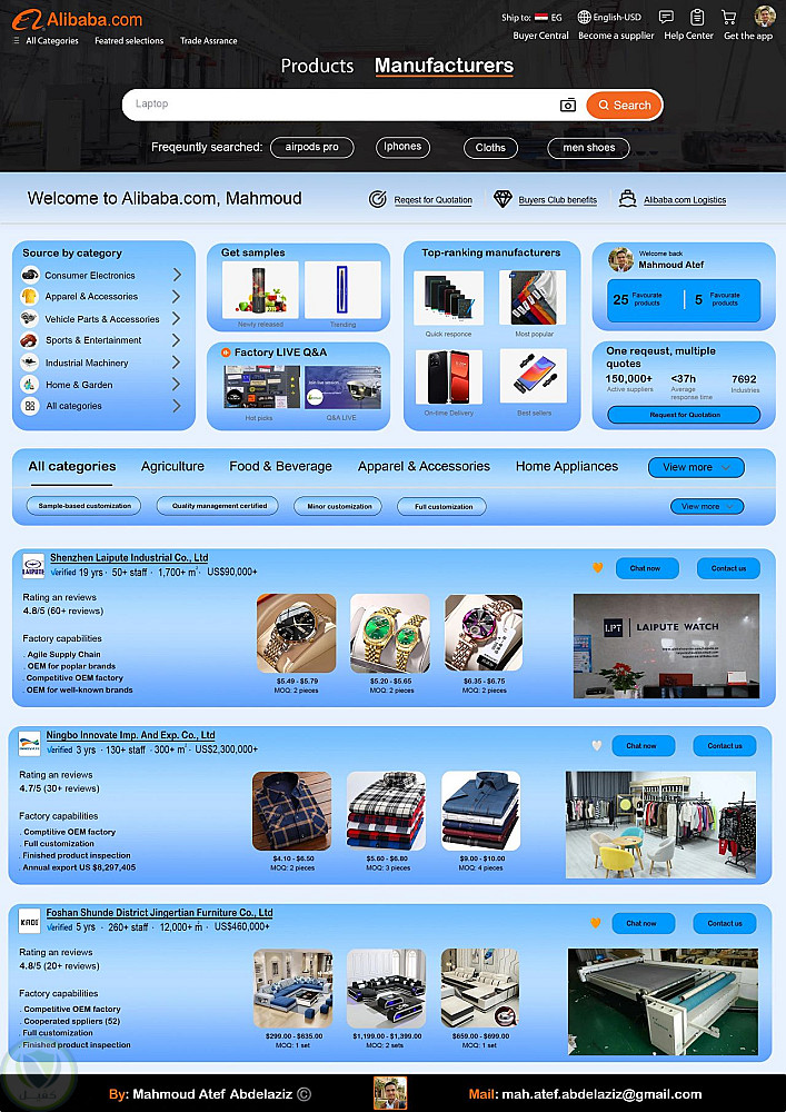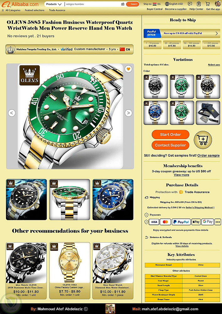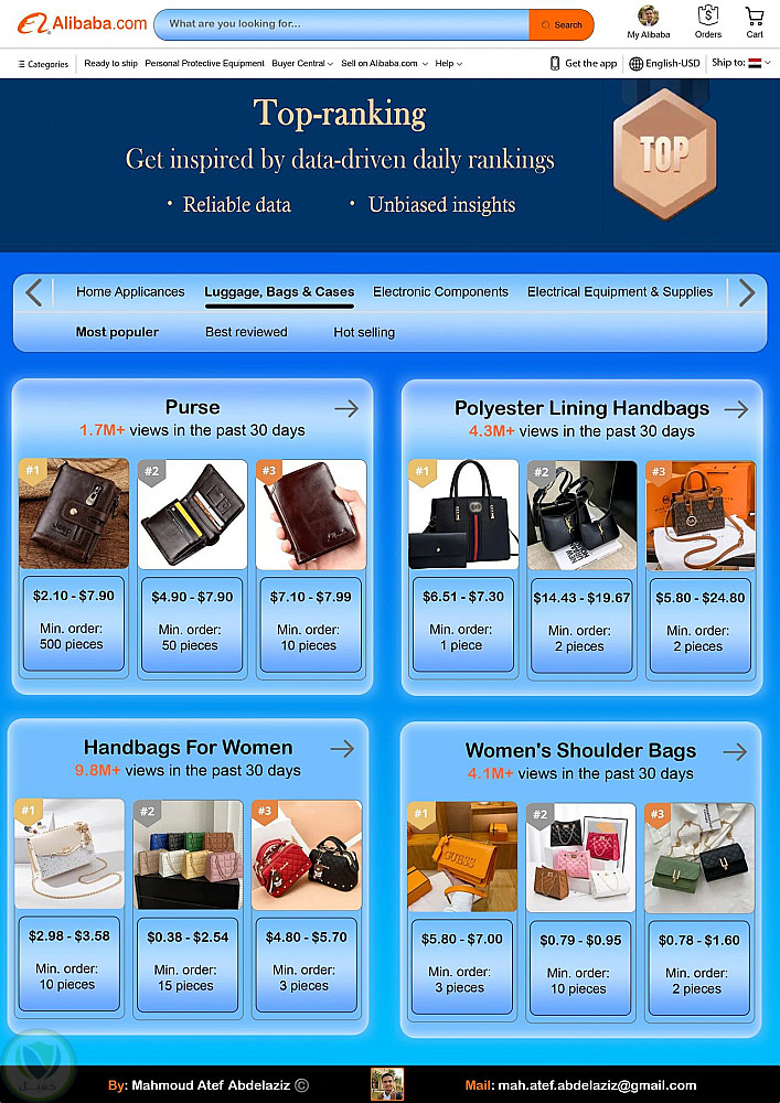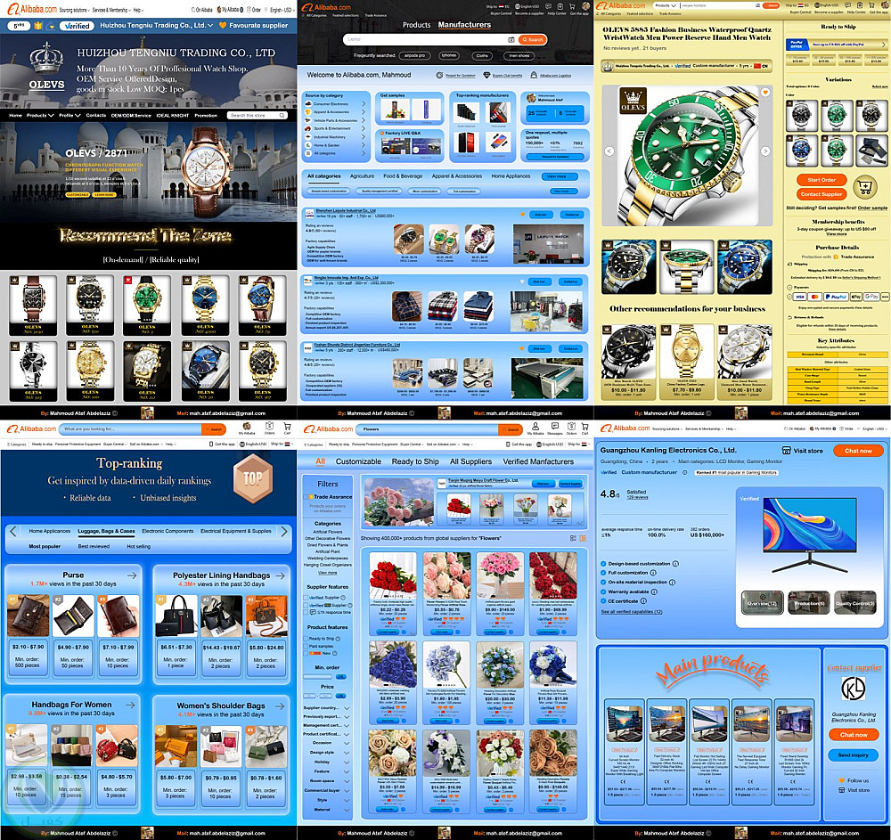 يتضمن المشروع تجميع وتحليل واجهات مستخدم لعدة متاجر وصفحات منتجات من موقع Alibaba.com، حيث قمت بتصميم لوحة شاملة تحتوي على لقطات واقعية ومتنوعة للمنتجات الأكثر شيوعًا، مثل الساعات، الحقائب، الزهور الصناعية، والإلكترونيات. يهدف المشروع إلى: