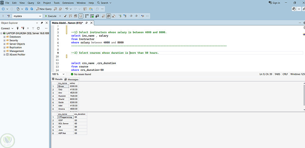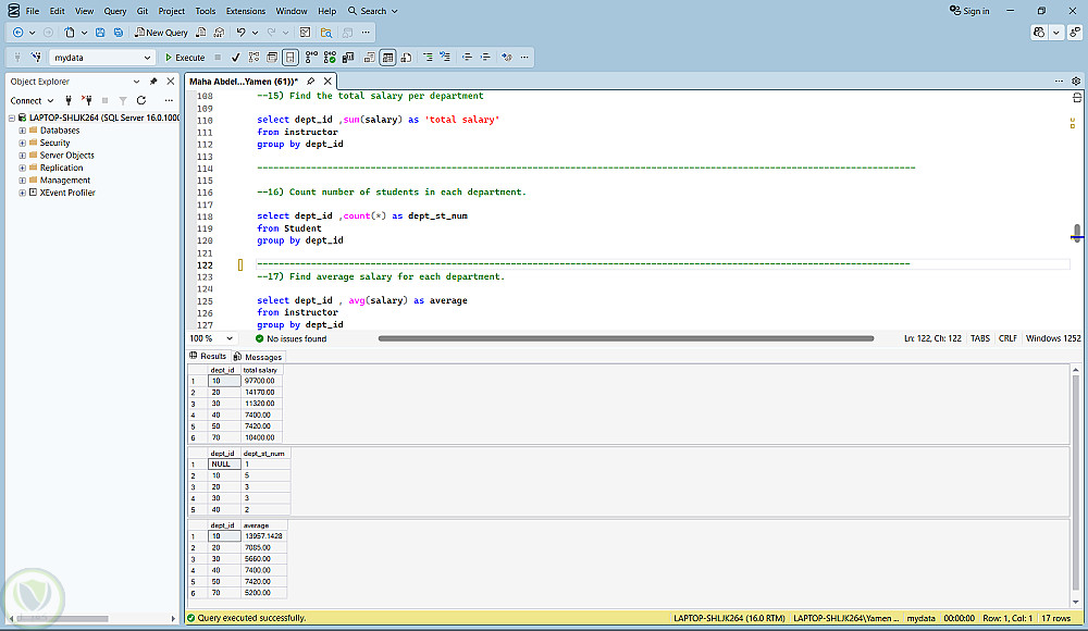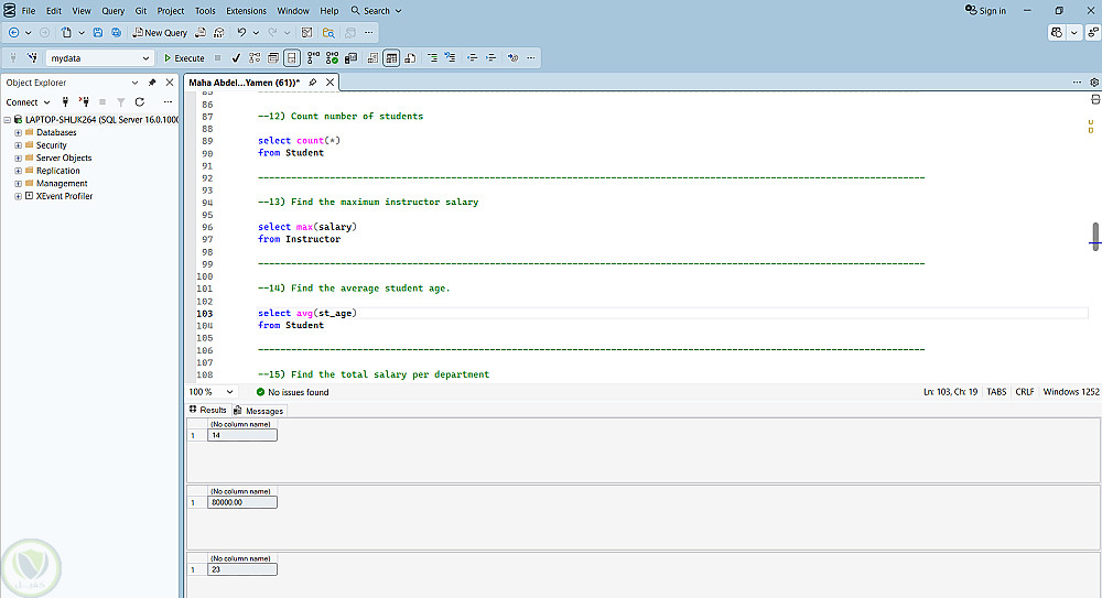 استخدام SQL server فى عمل استعلامات لتحديد بيانات معينة من قاعدة بيانات بناء على شرط محدد , استعلامات اخرى لإيجاد اعلى مرتب و المتوسط و عدد الطلبة فى قاعدة البيانات و استعلامات اخرى عن ايجاد مجموع المرتبات لكل قسم