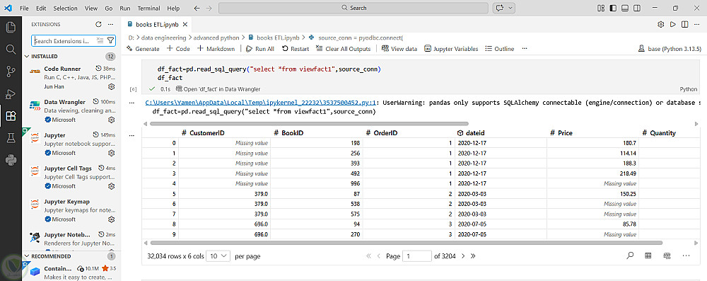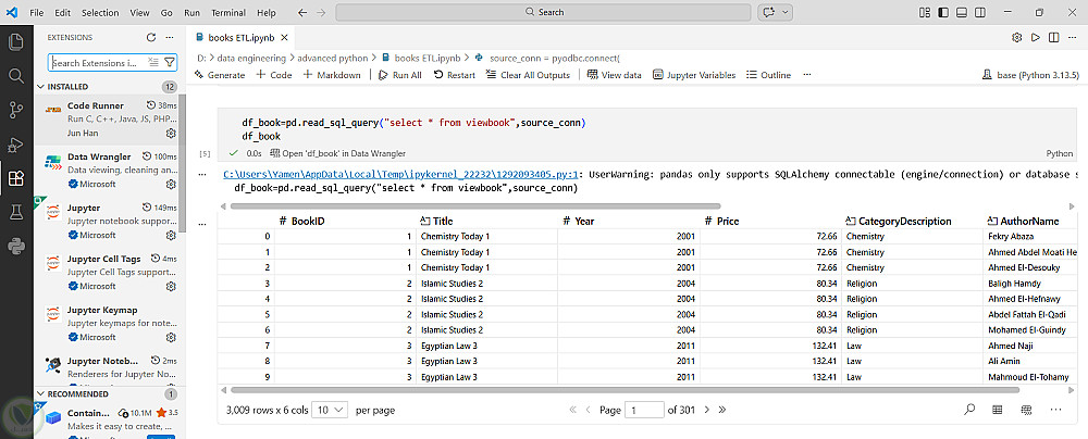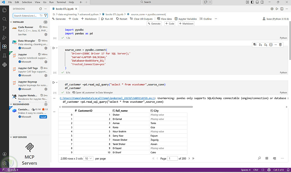 ربط قاعدة بيانات موجودة فى SQL Server ببايثون و استخدام مكتبة Panadas لتحويلها الى