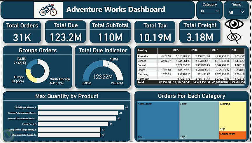 داشبورد تفاعلية متكاملة لبيانات شركة "Adventure Works" مصممة بنمط الألوان الداكنة (Dark Theme) لإبراز البيانات المهمة وتقليل إجهاد العين. تركز اللوحة على تحليل المبيعات وتوزيعها عبر المناطق الجغرافية والفئات المختلفة على مدار عدة سنوات.