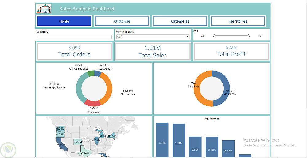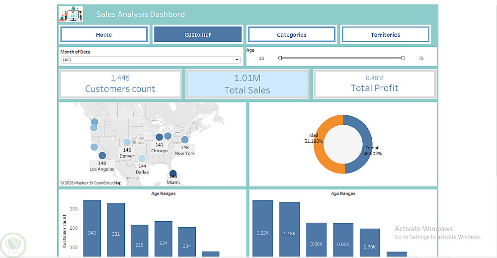 يهدف هذا المشروع إلى تطوير لوحة تحكم تفاعلية لتحليل المبيعات، تساعد الشركات على متابعة الأداء وفهم سلوك العملاء واتخاذ قرارات مبنية على البيانات. تعرض اللوحة إجمالي المبيعات والطلبات والأرباح، مع تحليلات تفصيلية حسب العمر والجنس والفئات والمناطق. توفر فلاتر تفاعلية ورسومًا بيانية وخرائط لعرض الاتجاهات وأفضل المناطق أداءً. تسهم في تحسين الأداء البيعي وتقديم تجربة استخدام سهلة. تم تنفيذها باستخدام Tableau للتصور وExcel لإعداد البيانات.
