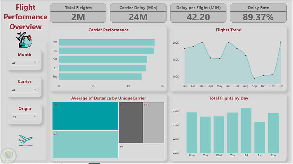 قمت في هذا المشروع بتحليل بيانات ضخمة لرحلات طيران، بهدف استخراج رؤى واضحة حول أسباب تأخير المواعيد وكيفية تحسين الأداء التشغيلي.