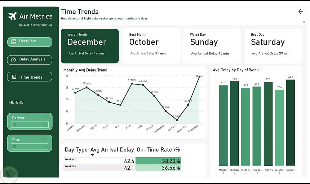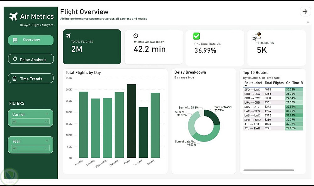 داشبورد تحليلي متكامل من 3 صفحات مبني على مجموعة بيانات تأخير الرحلات الأمريكية 2008 التي تحتوي على أكثر من مليوني رحلة.