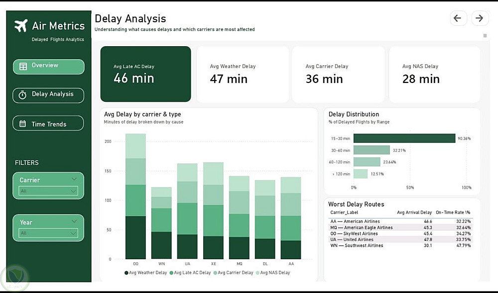Delay Analysis — تحليل أسباب التأخير لكل شركة طيران مع توزيع نطاقات التأخير