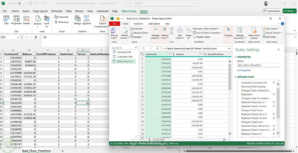 تنظيف ودمج بيانات فقدان العملاء في البنك باستخدام Excel Power Query