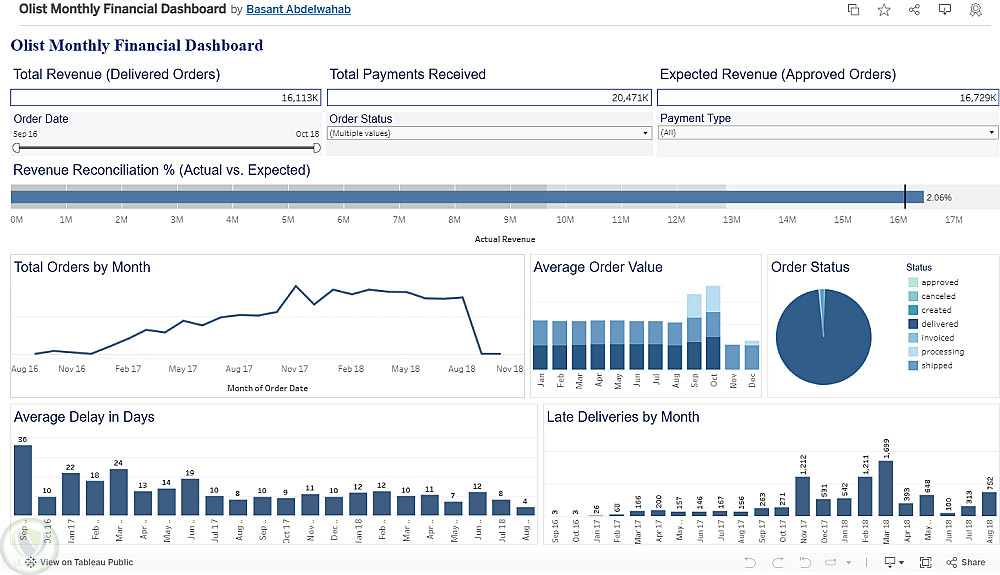 لوحة تحكم مالية شهرية لشركة Olist باستخدام Tableau