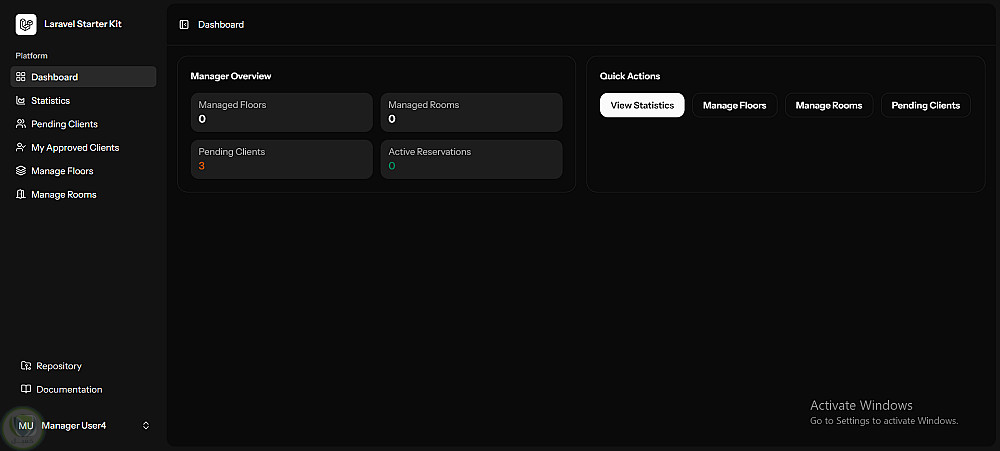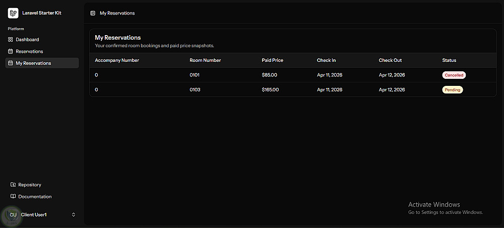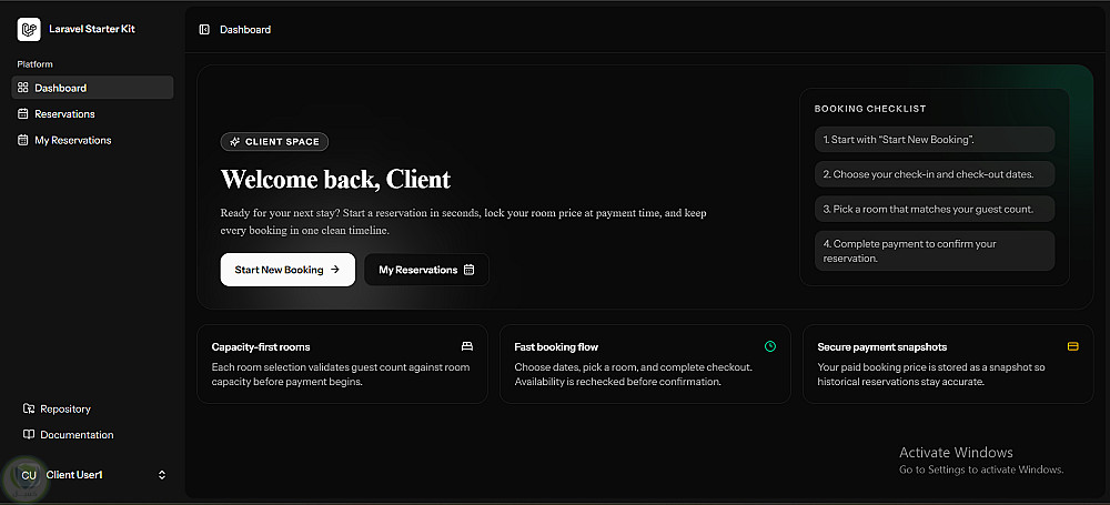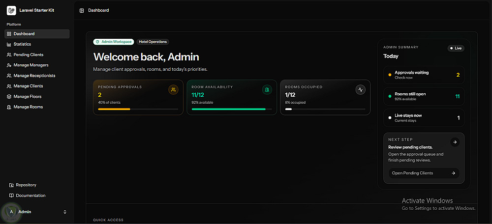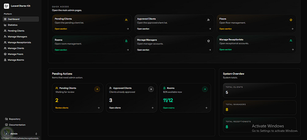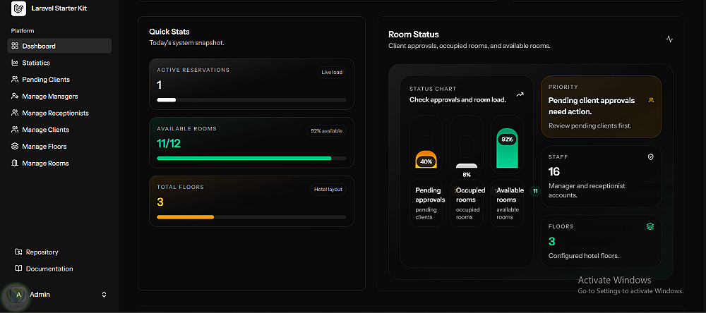 النظام يدعم تعدد الصلاحيات (Admin / Manager / Receptionist / Client) مع لوحات تحكم مخصصة لكل دور، مما يسهل إدارة الغرف والحجوزات والعملاء بشكل احترافي.