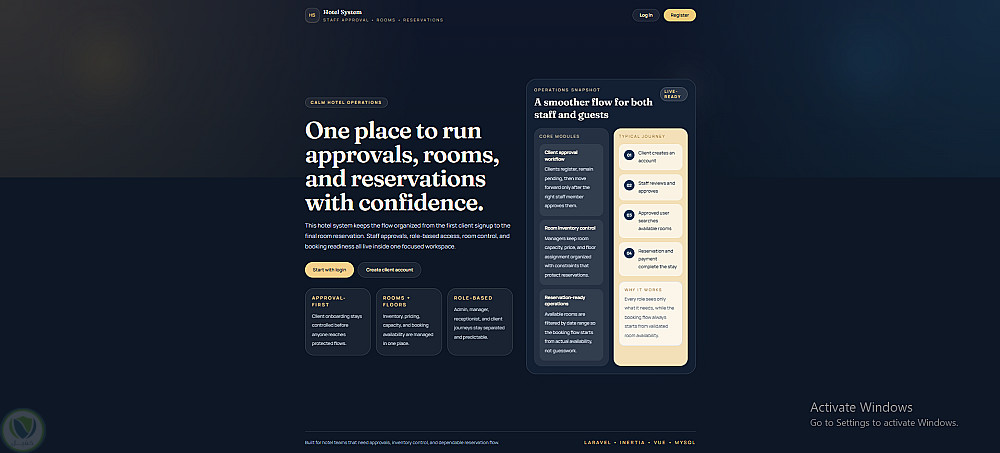 قمت بتطوير نظام متكامل لإدارة الفنادق باستخدام Laravel وInertia.js وVue 3، يوفر منصة حديثة لإدارة العمليات اليومية داخل الفندق بشكل منظم وسهل.