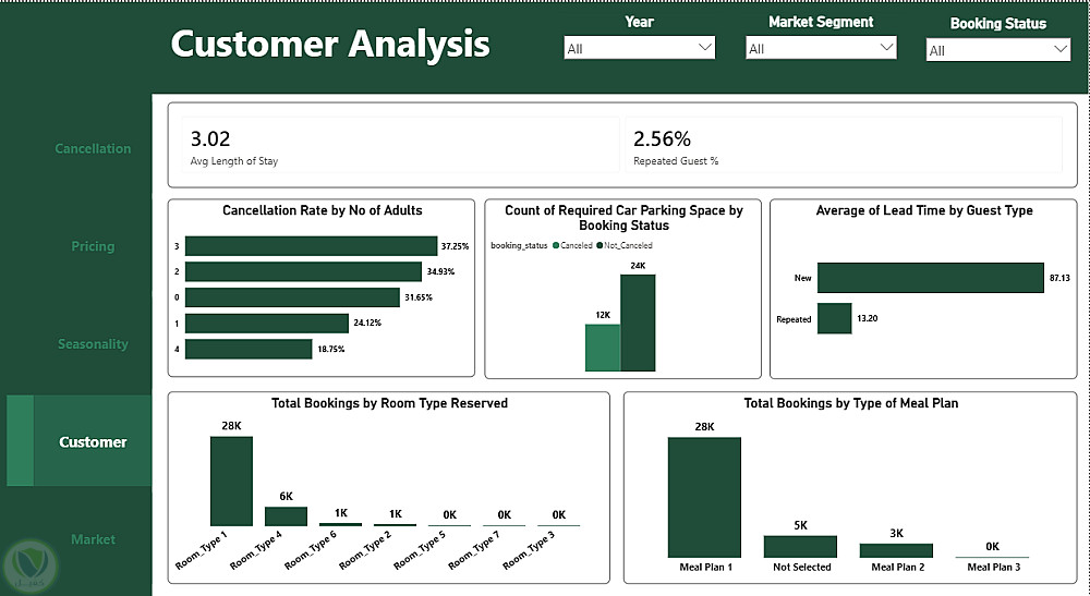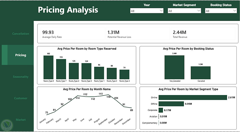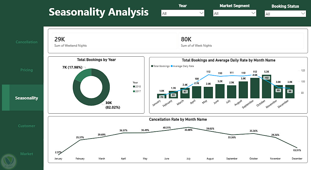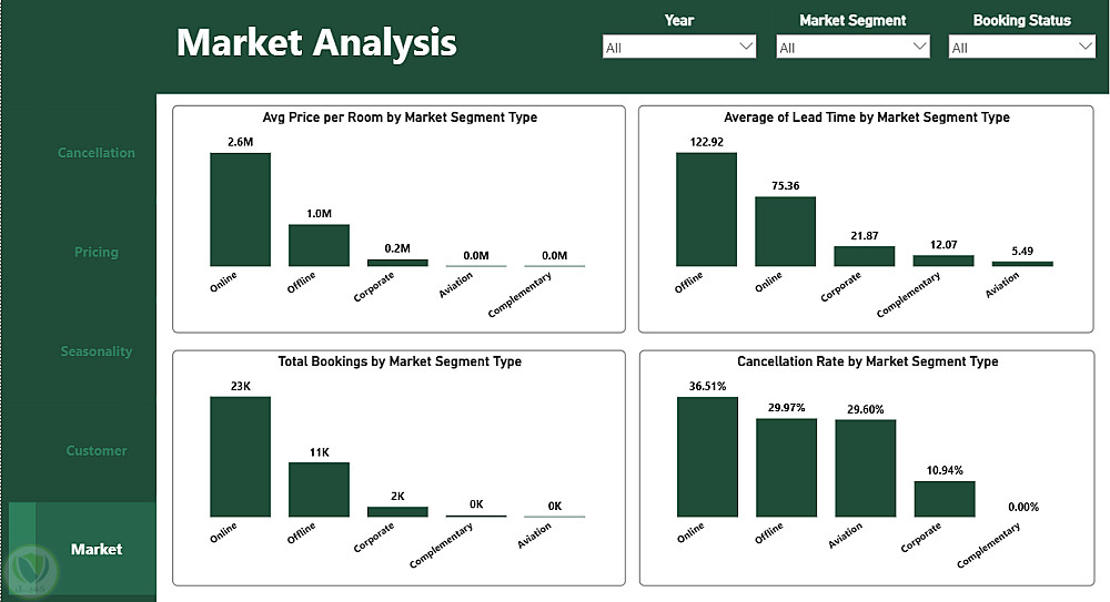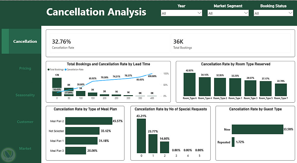 - داشبورد Power BI تفاعلي (5 صفحات): تحليل الإلغاء، التسعير، الموسمية، العملاء، والسوق