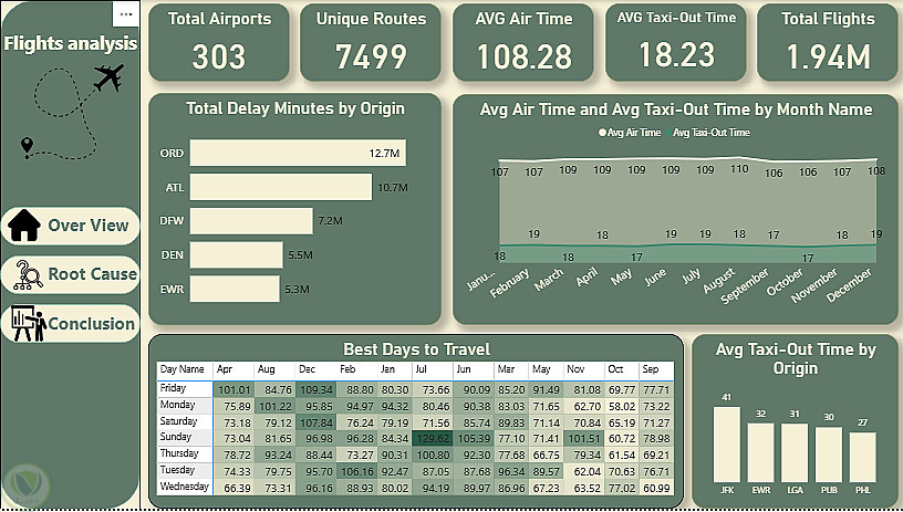 تقرير تفاعلي شامل (3 صفحات) لتحليل أداء قطاع الطيران باستخدام Power BI وPython، يعالج بيانات ضخمة لنحو 2 مليون رحلة.