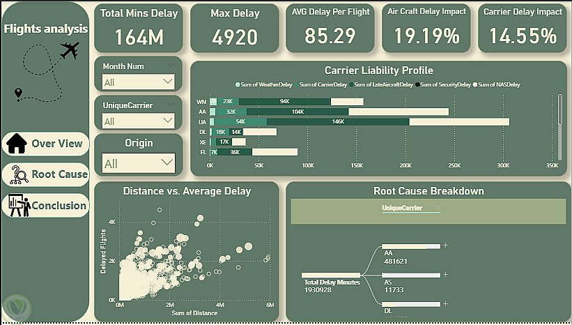 تحليل الأسباب الجذرية: تشخيص دقيق لمسؤولية التأخير (شركات، أعطال، طقس) باستخدام شجرة التحليل (Decomposition Tree) ودراسة ارتباط المسافة بالتأخير.