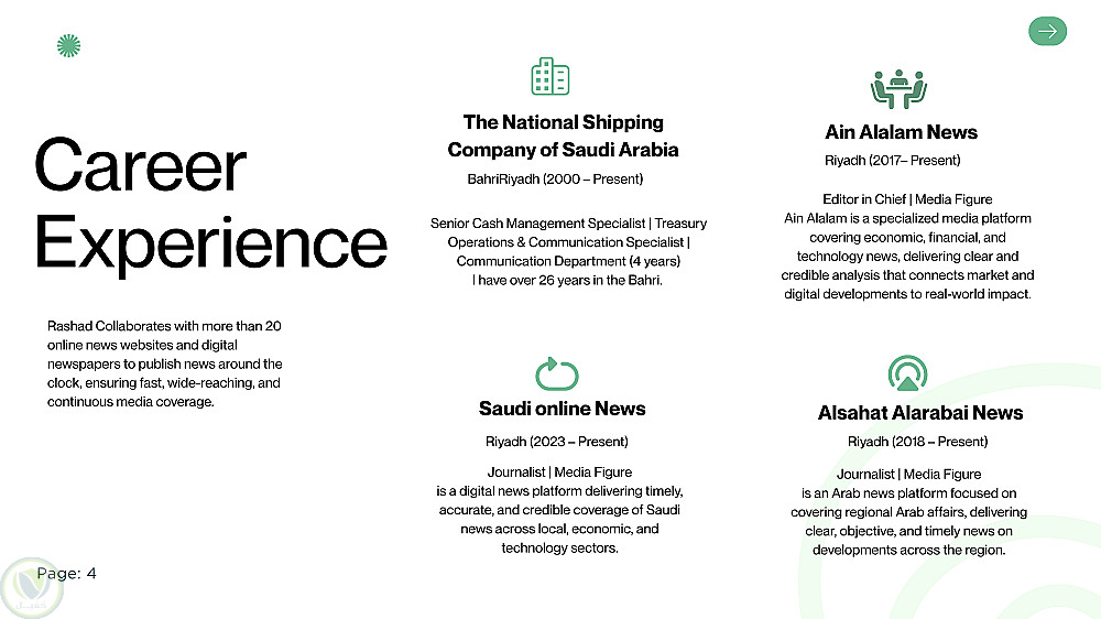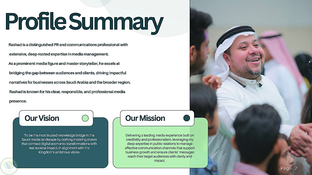 في عالم الأعمال المتسارع، لا يكفي أن تملك الخبرة، بل يجب أن تعرف كيف "تغلفها" وتقدمها بالشكل الذي يليق بك. قمت مؤخراً بتصميم ملف تعريف (Portfolio) للأستاذ رشاد إسكندراني، حيث ركزت على دمج مسيرته الإعلامية الممتدة لأكثر من 26 عاماً في قالب بصري يعكس الثقة، المصداقية، والريادة.