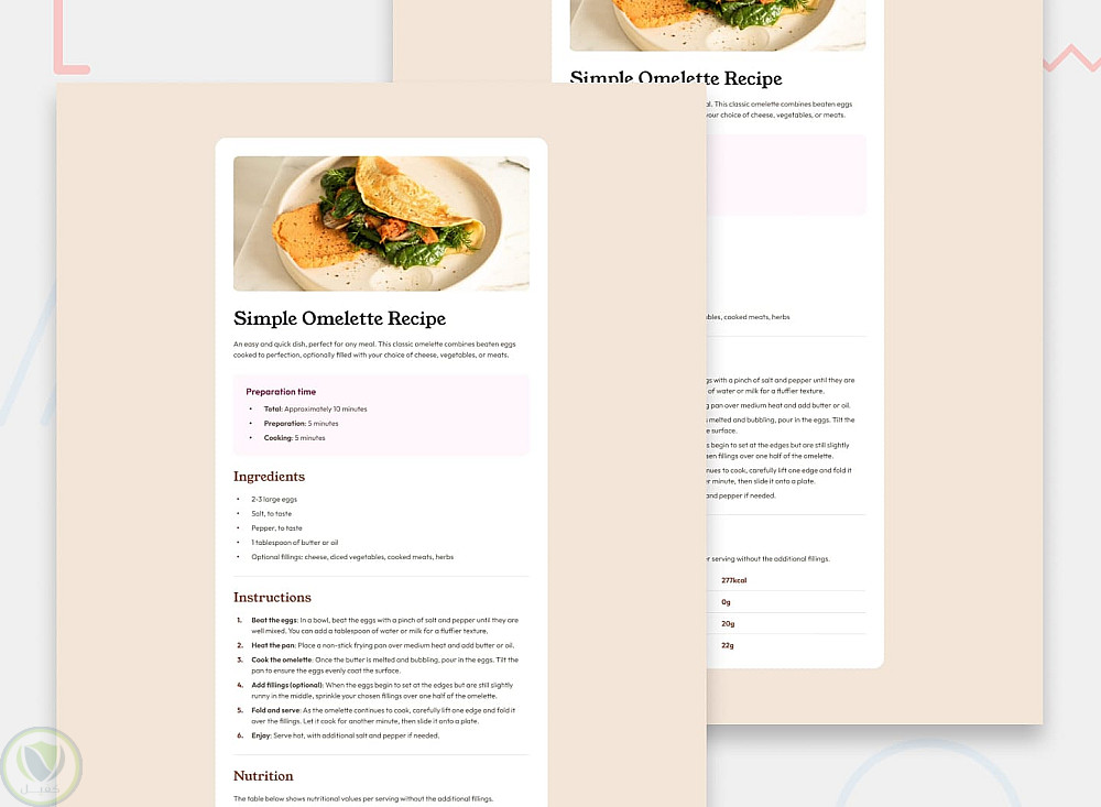 Simple Omelette Recipe هو مشروع Frontend بسيط بيعرض وصفة أومليت بشكل منظم وجذاب، مع التركيز على تصميم UI نظيف وتجربة مستخدم سهلة.