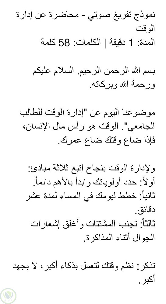 نموذج تفريغ صوتي - محاضرة عن إدارة الوقت