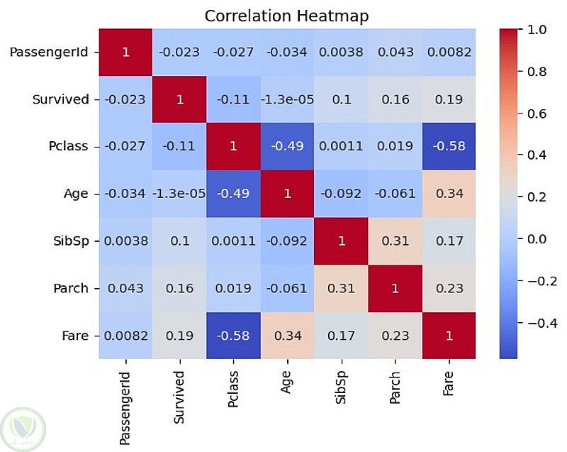 تحليل الارتباط (Correlation Analysis): إنشاء خريطة حرارية (Heatmap) لتوضيح العلاقات بين المتغيرات المختلفة مثل العمر، الدرجة، وسعر التذكرة.