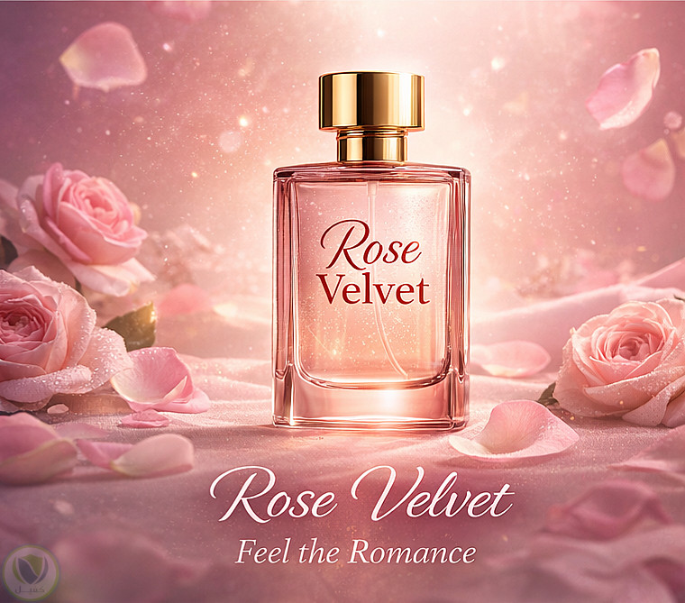 تصميم إعلاني رقيق لعطر نسائي (Rose Velvet).
