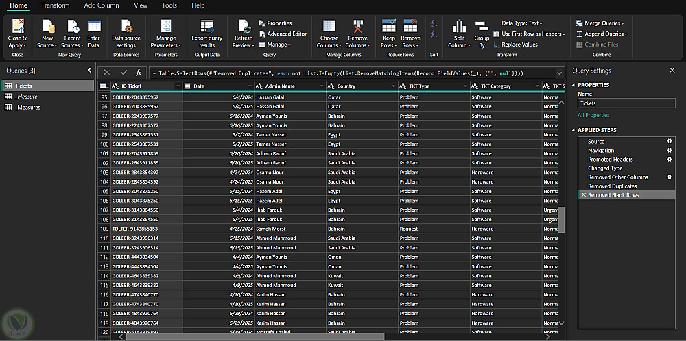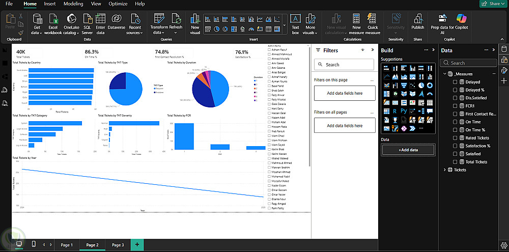 قمت أولًا بتنظيف البيانات باستخدام Power Query، حيث تم إزالة التكرارات، معالجة القيم المفقودة، توحيد تنسيق التواريخ والعملات، وضبط أنواع البيانات لضمان دقة النتائج. بعد ذلك تم تصميم نموذج بيانات منظم من خلال إنشاء العلاقات بين الجداول (المبيعات، المنتجات، الدول، الفروع، والتاريخ) لضمان إمكانية إجراء تحليلات دقيقة وقابلة للتوسع.