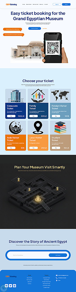 تصميم صفحة هبوط (Landing Page) متكاملة لمنصة GEM Ticketing، تهدف إلى تحويل الزوار إلى حاجزين فعليين من خلال رحلة مستخدم بسيطة ومباشرة تبدأ من التعرف على المتحف وصولاً إلى إتمام عملية الحجز.